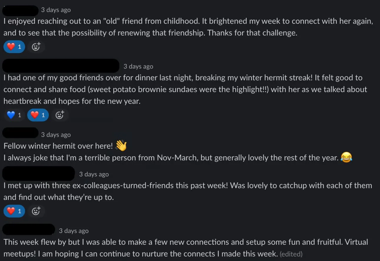 Here are a few responses to: share something positive that happened this week in relation to connection or friendship.